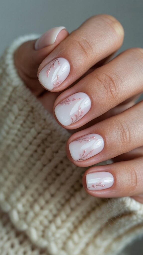 Glossy short almond nails in sheer blush base, two accent fingers featuring hand-painted delicate pink branch motifs with tiny buds and fine negative-space detailing. The high-shine finish enhances the softness, and the elongated shape flatters every hand. Minimalist, poetic, and full of early-spring whisper—like breath on cold glass turning to bloom.
