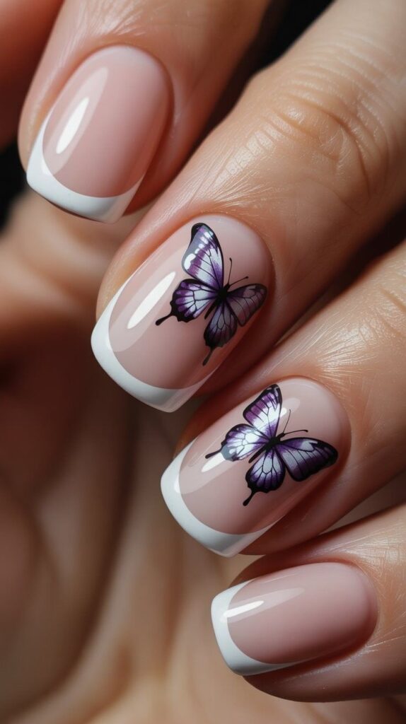 Glossy short almond nails in sheer nude base with crisp white French tips, two accent fingers featuring hand-painted iridescent purple butterflies (black outlines, translucent wings). The high-shine finish enhances the shimmer, and the elongated shape flatters every hand. Ethereal, poetic, and full of quiet transformation—like metamorphosis made visible.