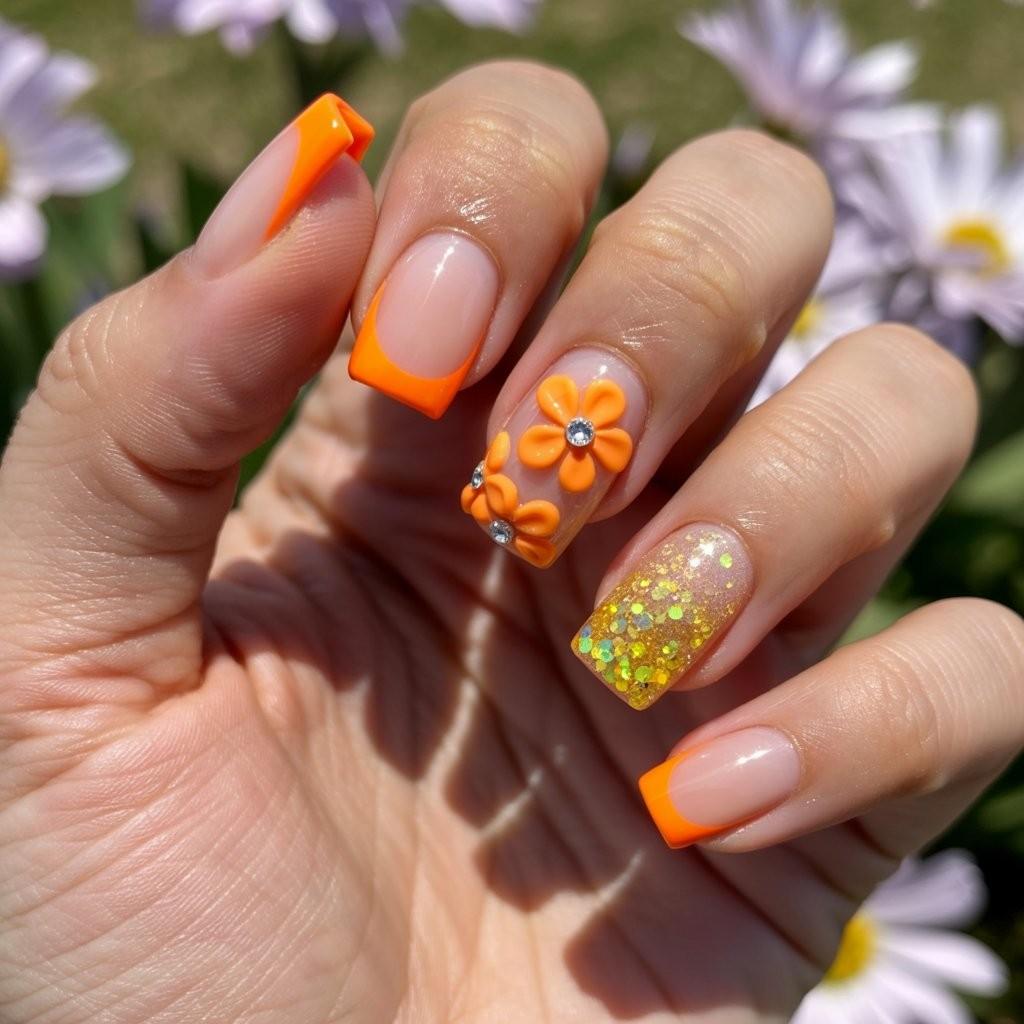 Sheer nude short almond nails with coral-orange French tips, 3D orange blossoms + crystal + iridescent glitter. High-shine, elongated. Bold, dimensional, radiant—sunlight captured in resin.