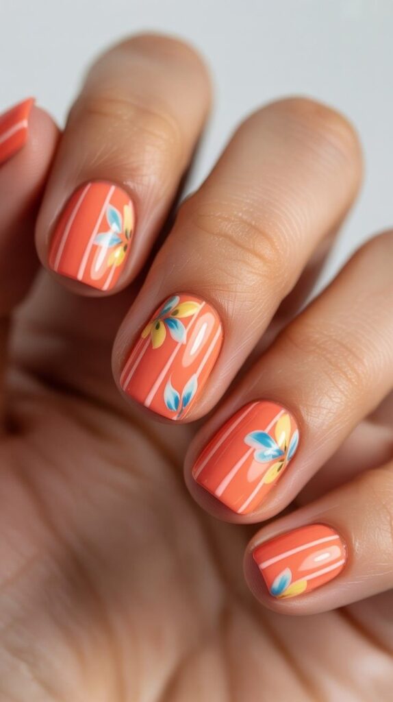 Glossy short oval nails in coral, with white diagonal stripes + delicate blossoms. High-shine, oval shape. Bright, clean, rhythmic—like sunshine through stained glass.
