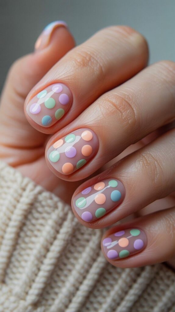 Short squoval nails in sheer nude base, adorned with scattered pastel polka dots in mint, peach, lavender, and coral—playful, cohesive, and full of cheerful energy. The high-shine finish makes the colors glow, and the compact shape ensures all-day wearability. Not childish—celebratory, like confetti caught in golden-hour light.