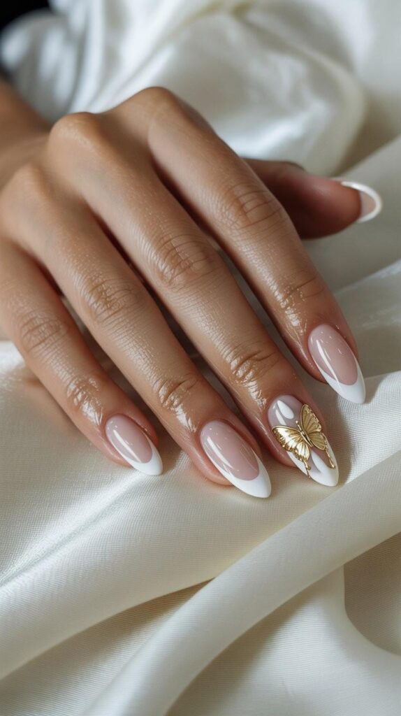 Glossy short square nails in sheer nude base with crisp white French tips, one accent finger featuring a raised 3D gold metallic butterfly (fine wing detailing, slight iridescence). The high-shine finish makes the gold glow, and the crisp square shape ensures modern sophistication. Poetic, luxurious, and full of quiet transformation—like hope taking flight.