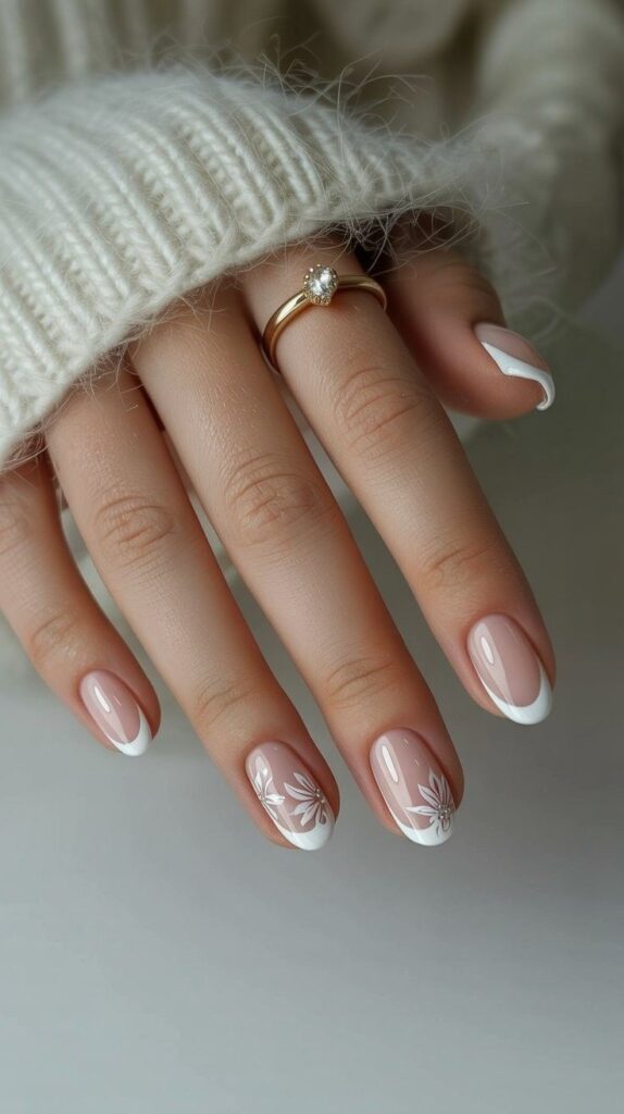 Glossy short squoval nails in sheer nude base with crisp white French tips, two accent fingers featuring delicate hand-painted white floral motifs (fine black outlines, subtle gold-dot centers) nestled near the cuticle. The high-shine finish sharpens the contrast, and the compact shape ensures all-day wearability. Serene, elegant, and full of quiet grace—like a sigh of relief, polished.
