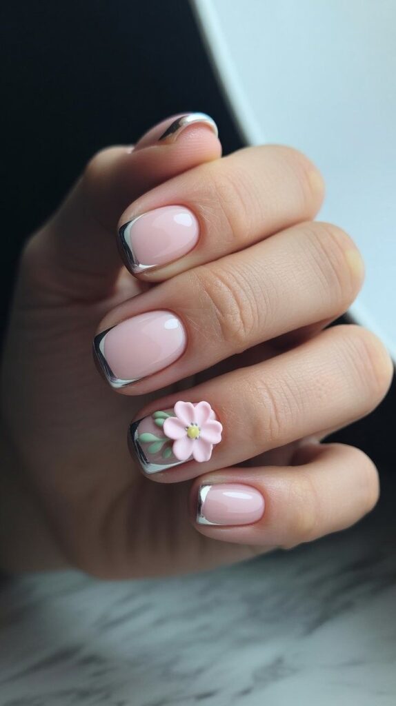 Blush base + silver-chrome French tips, one accent with 3D pink blossom. Sophisticated, minimalist, luxurious—like a whispered promise of renewal.