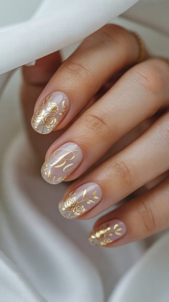 Glossy short square nails in soft nude base, two accent fingers featuring delicate gold metallic script (“Be” or “Bloom”) paired with hand-painted rose motifs and fine leaf linework. The high-shine finish enhances the luxury, and the crisp square shape ensures modern sophistication. Intentional, romantic, and deeply personal—love written in light.
