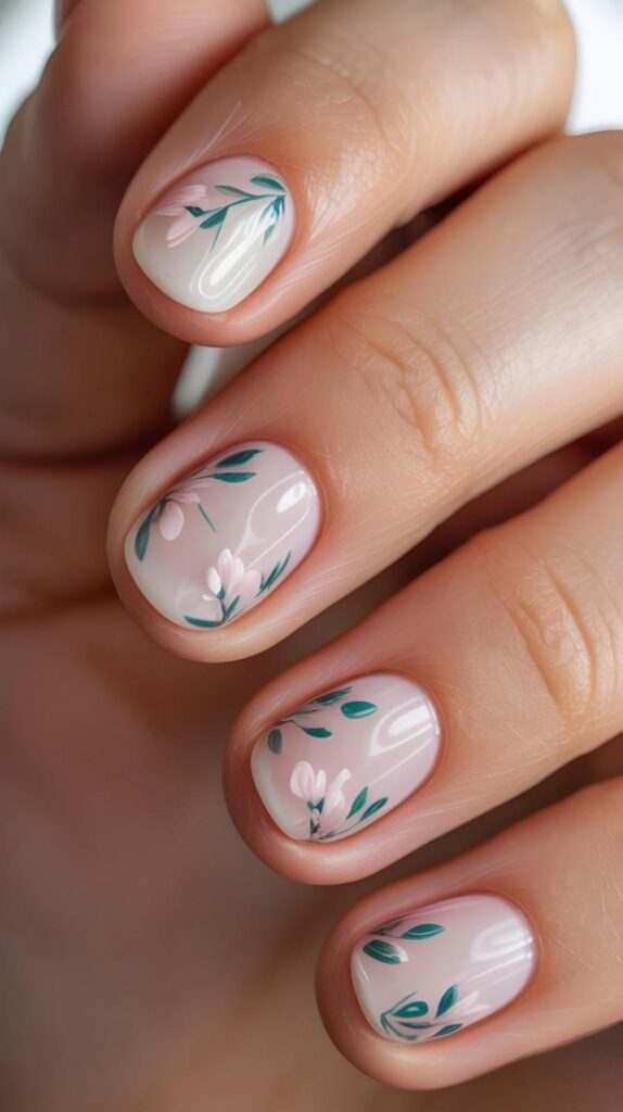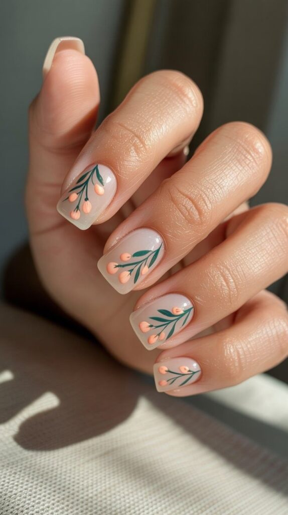 Sheer nude short oval nails, two accent fingers adorned with hand-painted delicate peach blossoms and fine green vine linework—soft watercolor washes add depth without heaviness. The glossy finish unifies the palette, and the oval shape ensures comfort and elegance. Serene, organic, and deeply calming—like first light on budding branches.