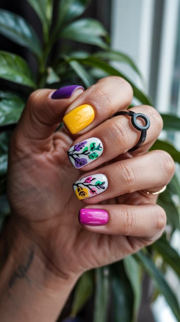 Sheer nude short almond nails with hand-painted blossoms in violet, yellow, pink, teal—connected by black-outlined vines. High-shine, elongated. Lush, poetic, wildflower energy—like a secret garden captured in light.