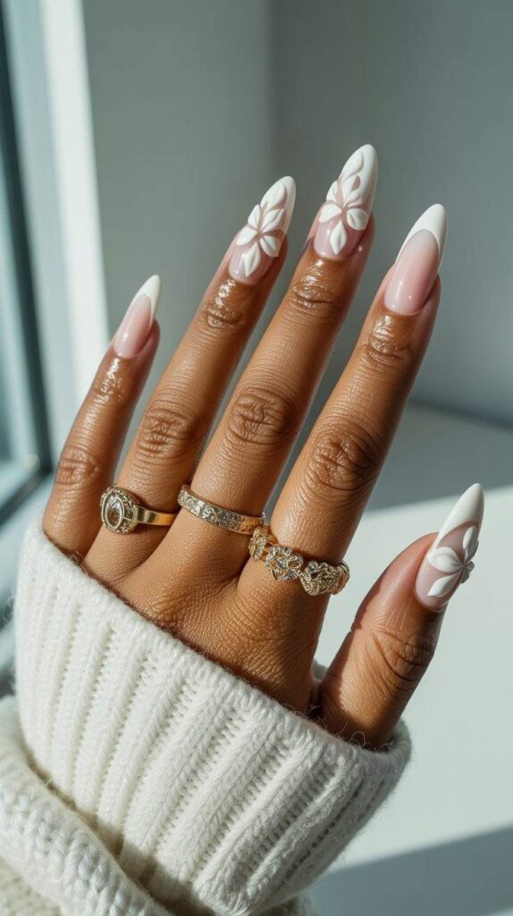 Glossy long almond nails in sheer nude base, two accent fingers featuring raised 3D white floral lace motifs—delicate petal layers, fine negative-space detailing, and subtle iridescence. The high-shine finish enhances dimension, and the elongated shape flatters every hand. Ethereal, refined, and full of bridal serenity—like heirloom lace reimagined for modern hands.