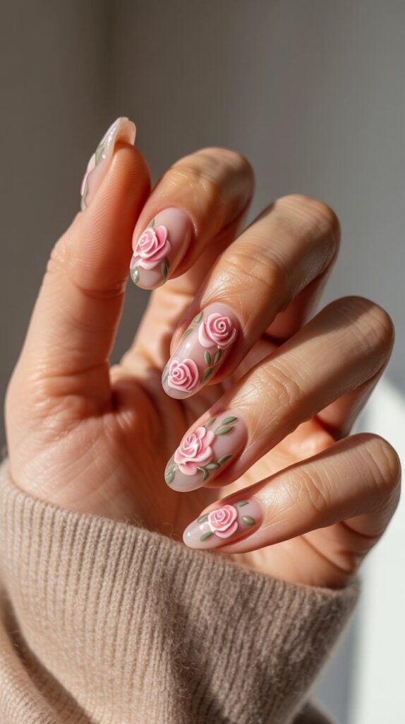 Sheer nude short almond nails, two accent fingers featuring raised 3D miniature pink roses (petal layers, gold stamens) clustered with fine green vine details. The glossy finish enhances the dimension, and the elongated shape flatters every hand. Luxurious, romantic, and deeply wearable—joy made tactile, love made visible.