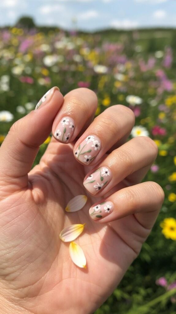 Sheer nude short oval nails adorned with scattered hand-painted white daisies (yellow centers) and fine green vines—paired with the hand resting gently in a sunlit wildflower meadow. The high-shine finish harmonizes with natural light, and the oval shape ensures comfort and elegance. Immersive, joyful, and deeply intentional—beauty that doesn’t imitate nature, but joins it.
