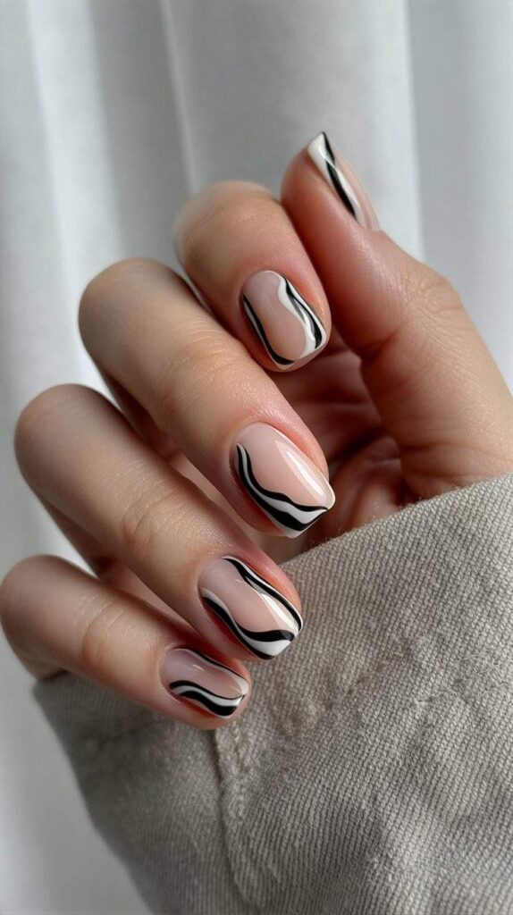 Glossy short squoval nails in sheer nude base, two accent fingers featuring fluid, overlapping black-and-white wave motifs—reminiscent of mid-century modern abstraction. The high-shine finish enhances the movement, and the compact shape ensures all-day wearability. Bold, minimalist, and full of rhythmic calm—like tide lines drawn in ink.