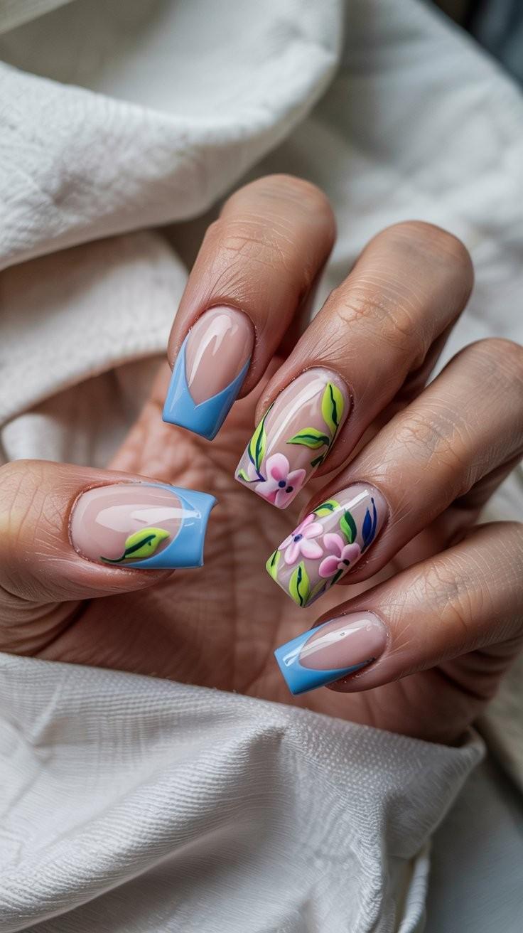 Glossy short square nails in nude with sky-blue French tips, two with pink blossoms + green stems. High-shine, crisp square. Serene, refined, promising—like clear skies after gentle rain.