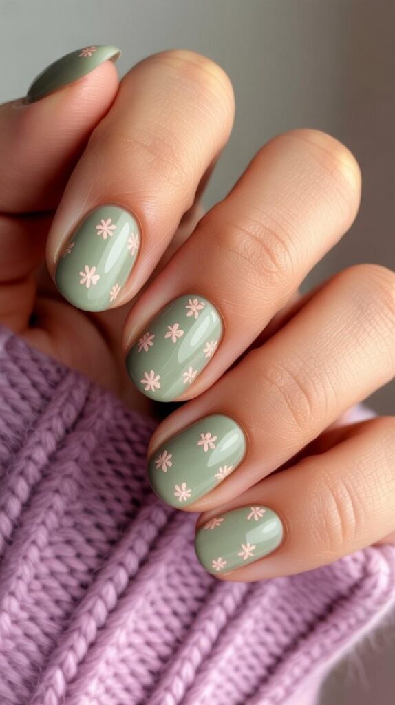 Glossy short almond nails in soft sage-green base, adorned with scattered hand-painted miniature pink daisies (white centers). High-shine finish, elongated shape. Gentle, cohesive, full of early-spring rhythm—like the first blooms peeking through cool soil.