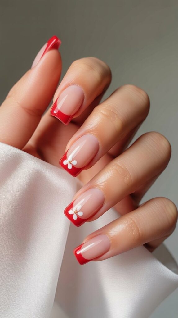 Glossy short square nails in sheer nude with cherry-red French tips, two accent fingers with white daisies (gold centers). High-shine, modern elegance. Classic, joyful, confident—like a love letter sealed with a kiss.