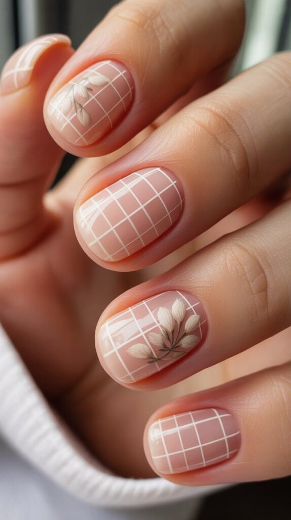 Glossy short square nails in soft nude base, two accent fingers featuring crisp white grid lines overlaid with delicate hand-painted white blossoms and green stems. The high-shine finish unifies the palette, and the crisp square shape ensures modern sophistication. Structured yet soft—like architecture softened by ivy.