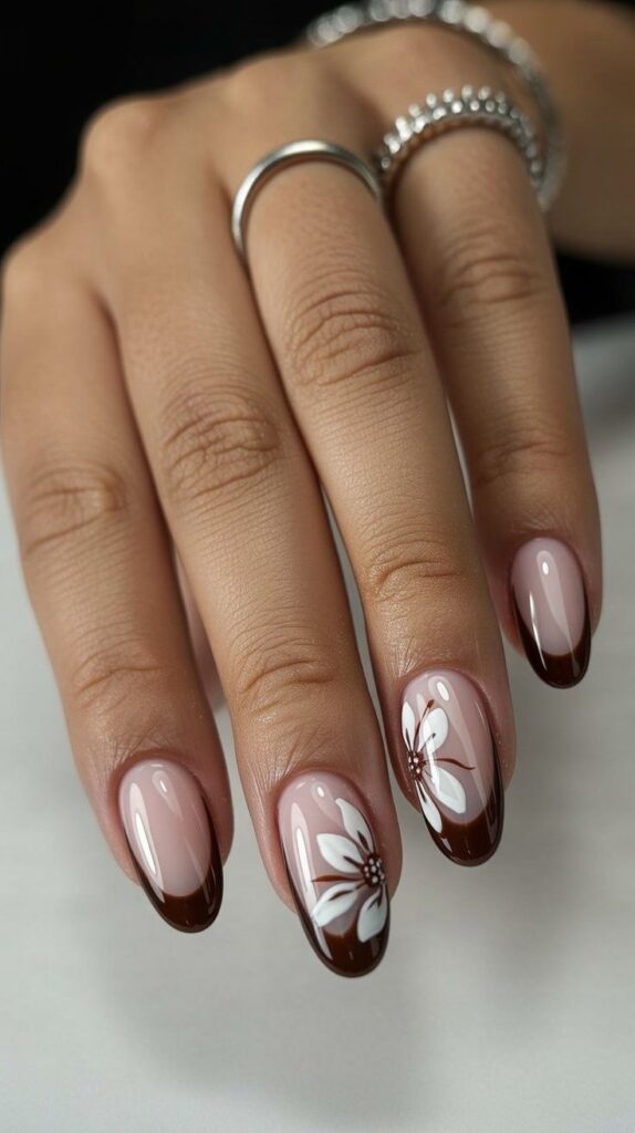 Glossy short almond nails in seamless nude-to-rich-brown ombré, two accent fingers featuring hand-painted white blossoms with fine black outlines and subtle watercolor depth. The high-shine finish enhances the dimension, and the elongated shape flatters every hand. Earthy, elegant, and full of grounded renewal—like soil warmed by first sunlight.