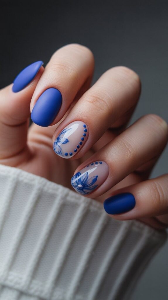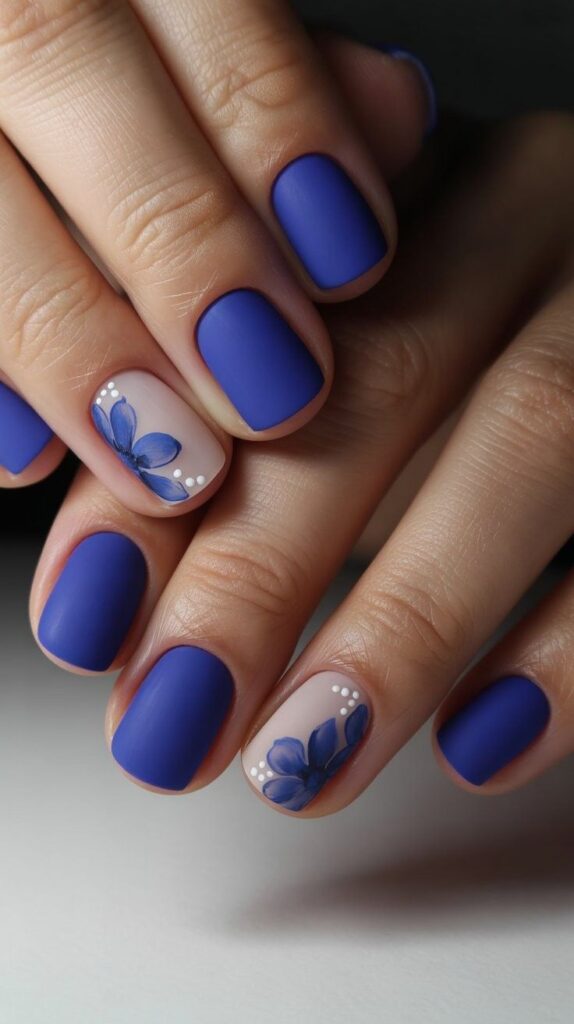 Matte medium-cobalt short square nails, two accent fingers featuring delicate hand-painted white blossoms with fine green stems and a single micro-pearl accent. The satin finish grounds the vibrancy, and the crisp square shape ensures modern sophistication. Bold yet serene—like deep water holding light.