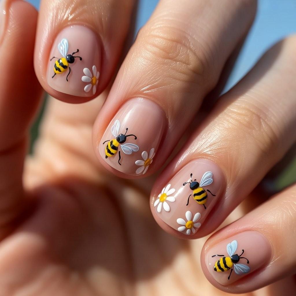 Sheer nude short almond nails with hand-painted bees + daisies + green vines. High-shine, elongated. Tender, joyful, magical—like a child’s wonder, polished.