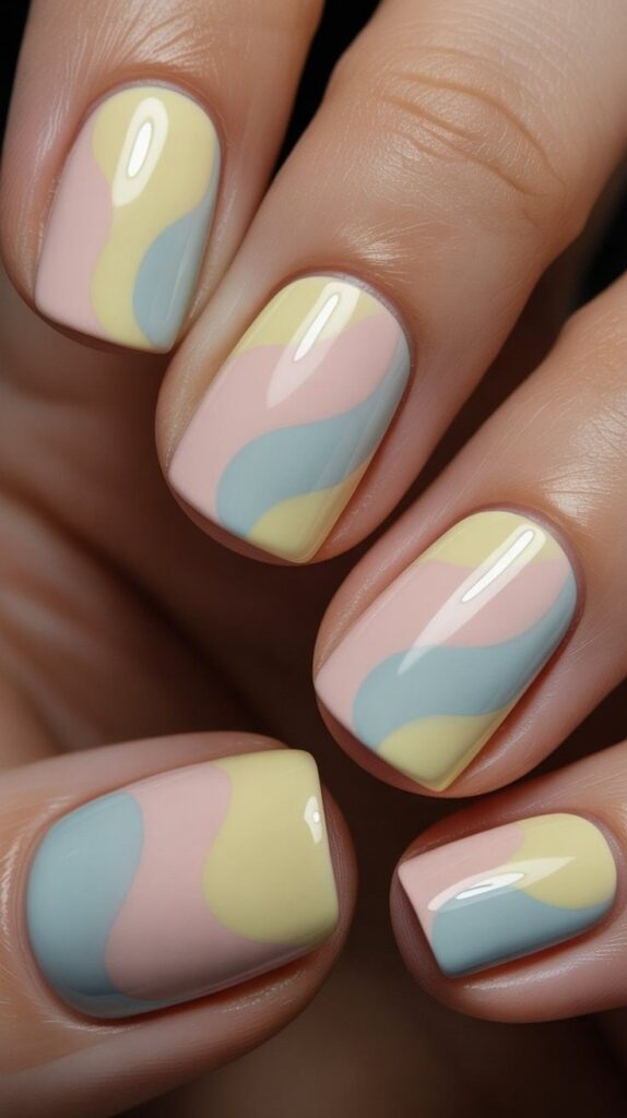 Glossy short oval nails in seamless gradient trio: blush-pink → lemon → sky-blue, featuring fluid, overlapping organic waves that flow across each nail. The high-shine finish enhances the luminosity, and the oval shape ensures comfort and elegance. Soft, dreamy, and full of kinetic calm—like light dancing on water.