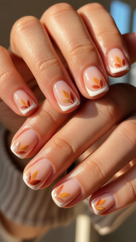 Glossy short almond nails in sheer nude base with crisp white French tips, two accent fingers featuring hand-painted miniature orange-and-amber leaf clusters (evoking early-spring “sunrise foliage”) with fine black outlines. The high-shine finish enhances warmth, and the elongated shape flatters every hand. Poetic, transitional, and full of gentle hope—like the first golden hints before full bloom.