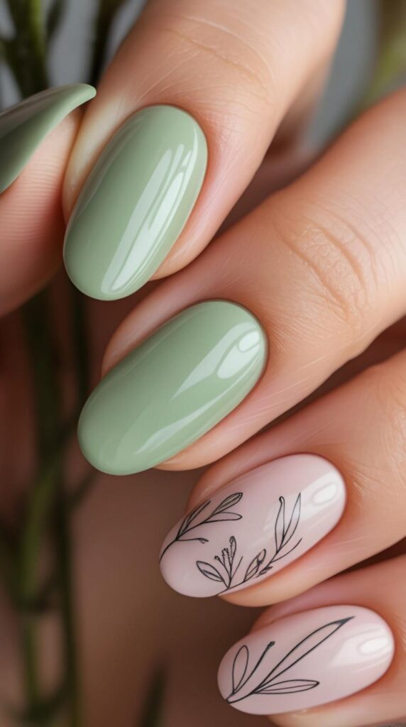 Glossy short almond nails in soft sage-green base, two accent fingers featuring delicate black-line botanical leaf motifs—fine, flowing, and full of negative-space poetry. The high-shine finish sharpens the contrast, and the elongated shape flatters every hand. Serene, modern, and deeply grounding—like a breath held in stillness before bloom.