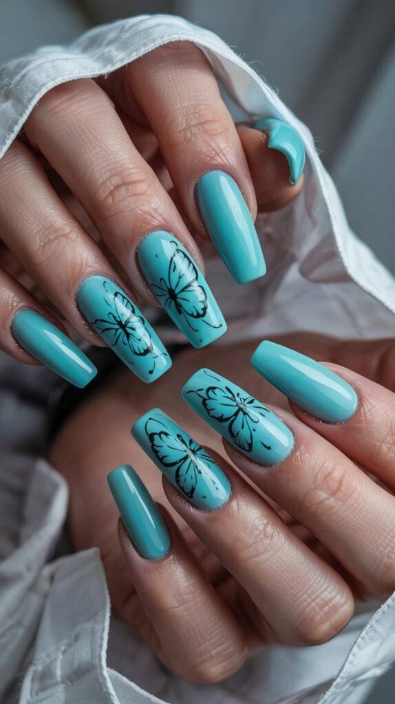 Glossy long stiletto nails in vibrant turquoise, four accent fingers featuring hand-painted black-outline butterflies with translucent wings and subtle negative-space detailing. The high-shine finish makes the graphics pop, and the sharp shape elongates with graceful confidence. Bold, airy, and full of joyful movement—like wings catching the breeze.