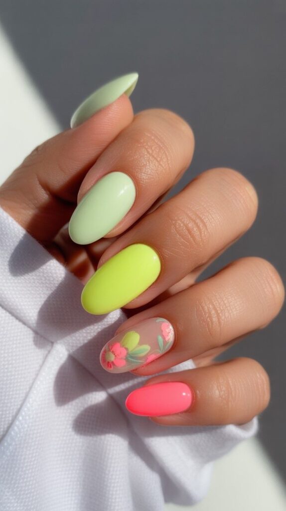 Short oval nails in lime → peach → coral, two with pink blossoms + green vines. Glossy, oval. Harmonious, joyful, wearable—like a meadow at golden hour.