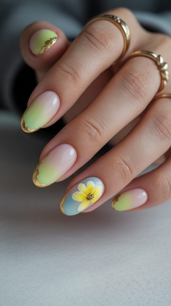 Glossy short squoval nails in nude-to-lime ombré, with gold-leaf edging + yellow blossom. High-shine, compact. Luxurious, poetic, reverent—like morning light on dew.
